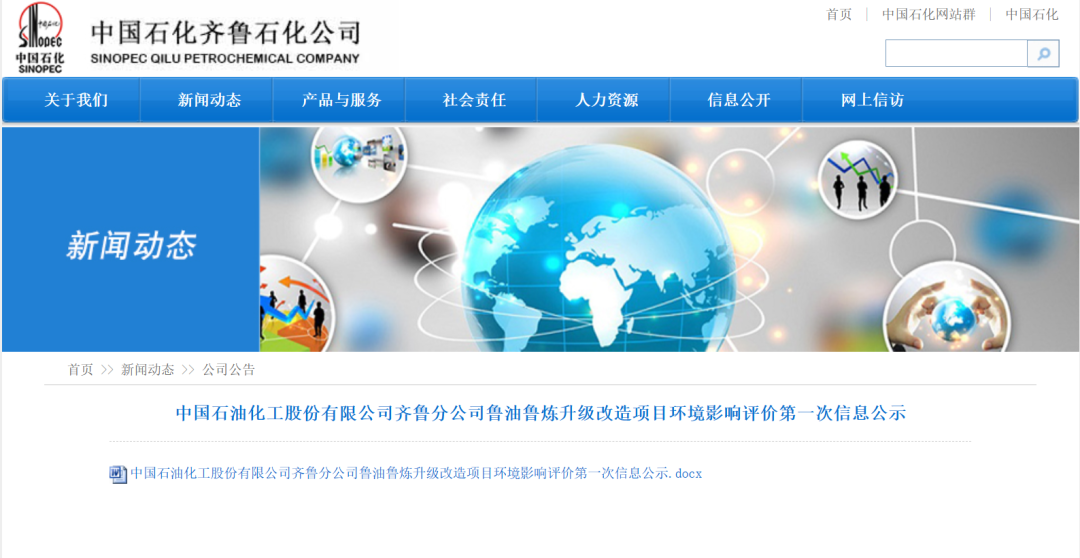11月6日,齐鲁石化官网发布了中国石油化工股份有限公司齐鲁分公司鲁油鲁炼升级改造项目环境影响评价第一次信息公示,面向社会各界对项目建设内容提出建议和意见。